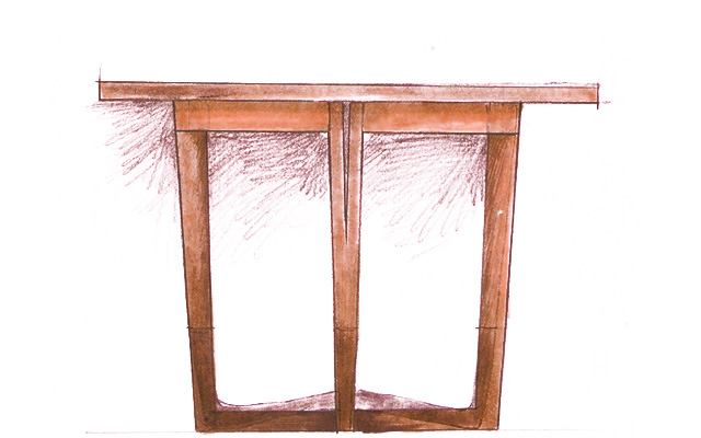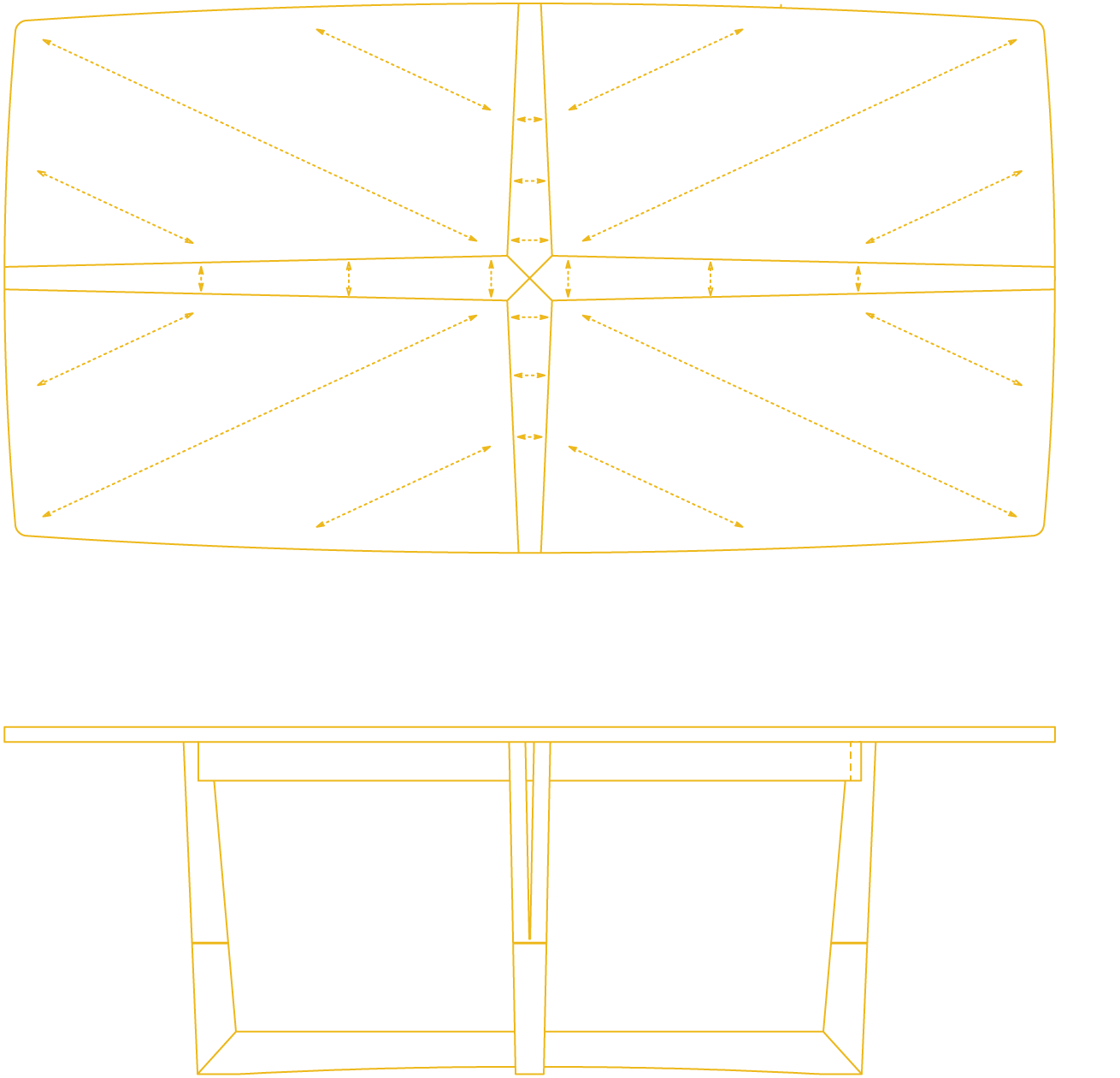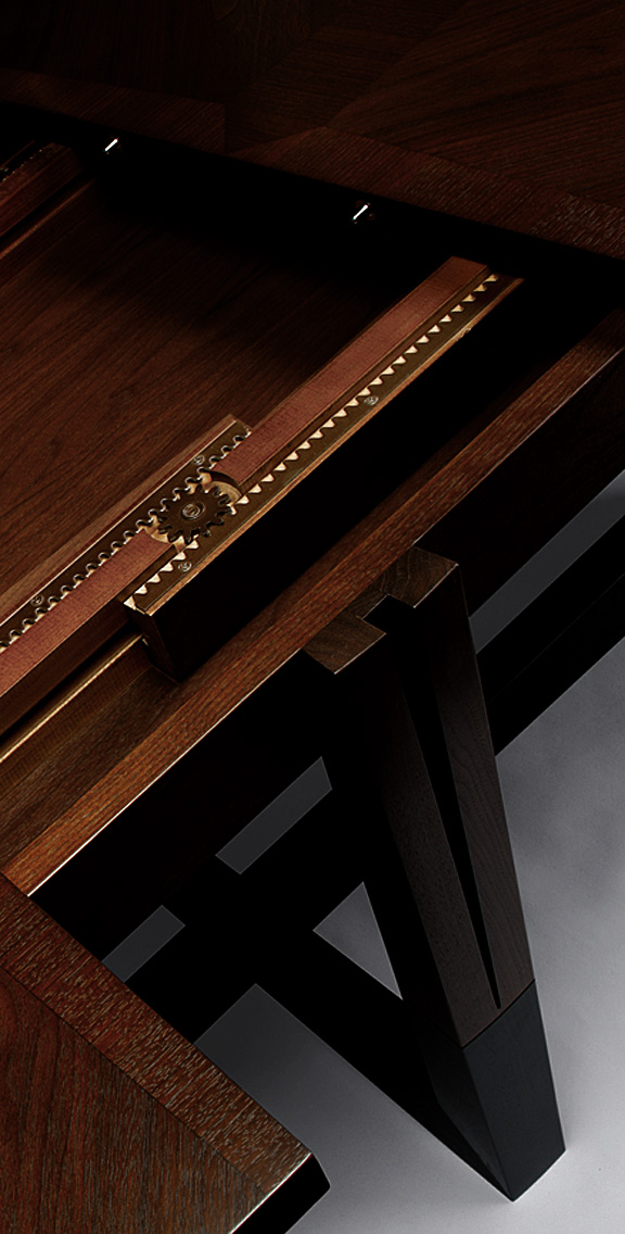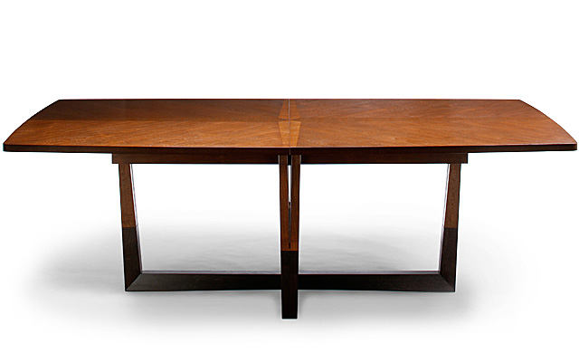 A dining table collection designed to grow and expand. Simple gestures in veneer patterning and construction merge the traditional with the contemporary. Highly engineered leg/base appears to split and create a passage of light in an otherwise solid leg structure.