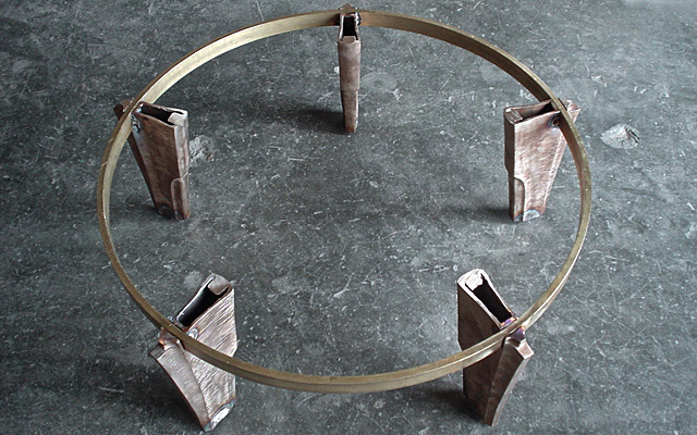The accompanying piece to the Carved Media Cabinet and at the center of a dramatic curved upholstered sofa, an organic interpretation of Jean Prouvè’s Gueridon Bas rendered in cast bronze and honed granite. The result of close collaboration with a bronze art foundry in California utilizes the lost wax process and traditional patination techniques.