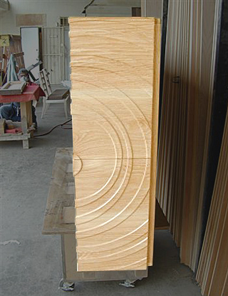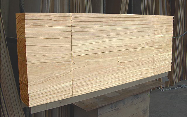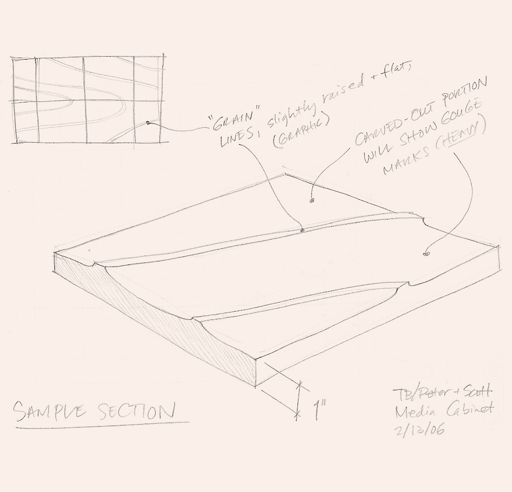 A multifunctional wall-hung media cabinet. Playing with visual scale, oversized wood grain carving overlies the real wood grain of solid wood panels. Heavily carved doors conceal a plasma television on a lift mechanism and media storage. Deceptively quiet with a strong, grounding presence. A local network of fabrication shops & craftspeople dedicatedly worked to realize this complex assembly of moving panels and mechanical magic.